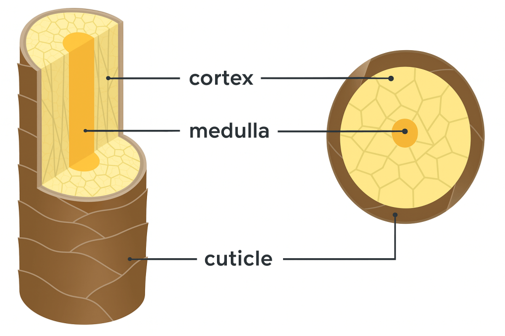 Es la parte externa y visible del cabello. Aunque parezca un simple filamento, es una estructura compleja compuesta por tres capas que trabajan juntas para darle fuerza, brillo y protección.