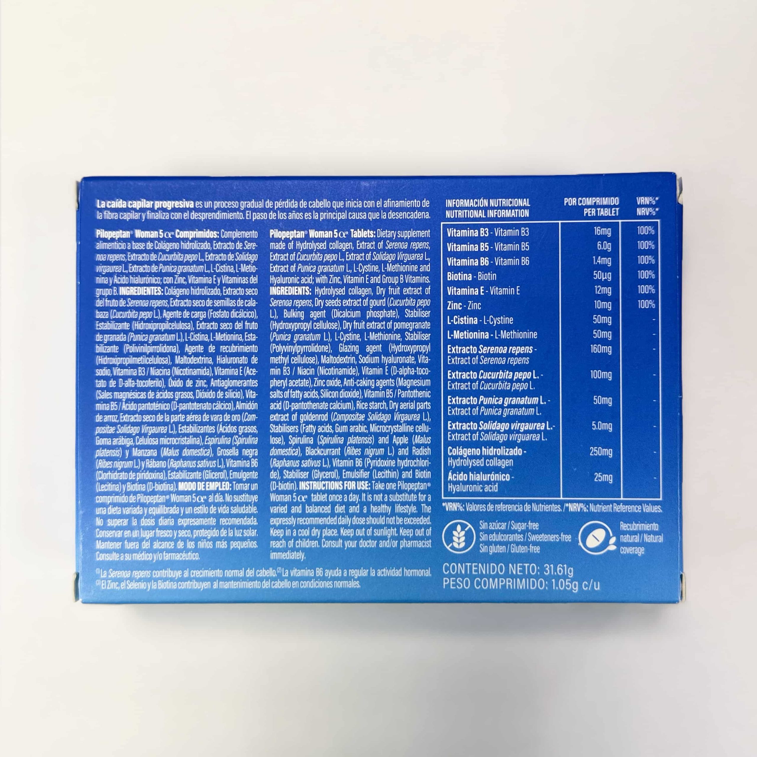 Colágeno hidrolizado, Extracto seco del fruto de Serenoa repens, Extracto seco de semillas de calabaza (Cucurbita pepo L.), Agente de carga (Fosfato dicálcico), Estabilizante (Hidroxipropilcelulosa), Extracto seco del fruto de granada (Punica granatum L.), L-Cistina, L-Metionina, Estabilizante (Polivinilpirrolidona), Agente de recubrimiento (Hidroxipropilmetilcelulosa), Maltodextrina, Hialuronato de sodio, Vitamina B3 / Niacina (Nicotinamida), Vitamina E (Acetato de D-alfa-tocoferilo), Óxido de zinc, Antiaglomerantes (Sales magnésicas de ácidos grasos, Dióxido de silicio), Vitamina B5 / Ácido pantoténico (D-pantotenato cálcico), Almidón de arroz, Extracto seco de la parte aérea de vara de oro (Compositae Solidago Virgaurea L.), Estabilizantes (Ácidos grasos, Goma arábiga, Celulosa microcristalina), Espirulina (Spirulina platensis) y Manzana (Malus domestica), Grosella negra (Ribes nigrum L.) y Rábano (Raphanus sativus L.), Vitamina B6 (Clorhidrato de piridoxina), Estabilizante (Glicerol), Emulgente (Lecitina) y Biotina (D-biotina).